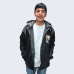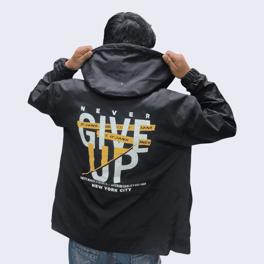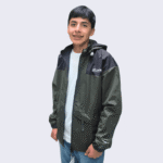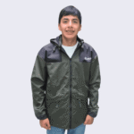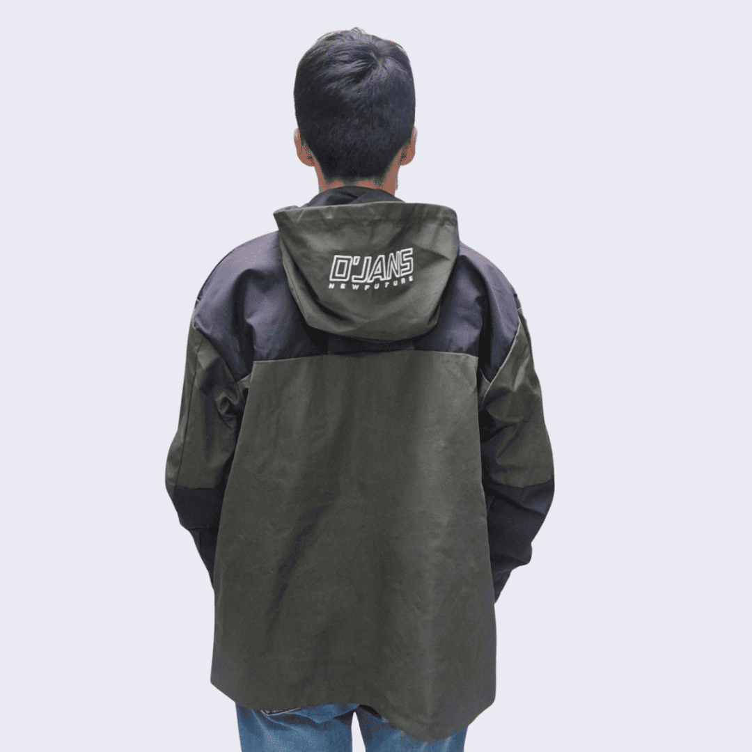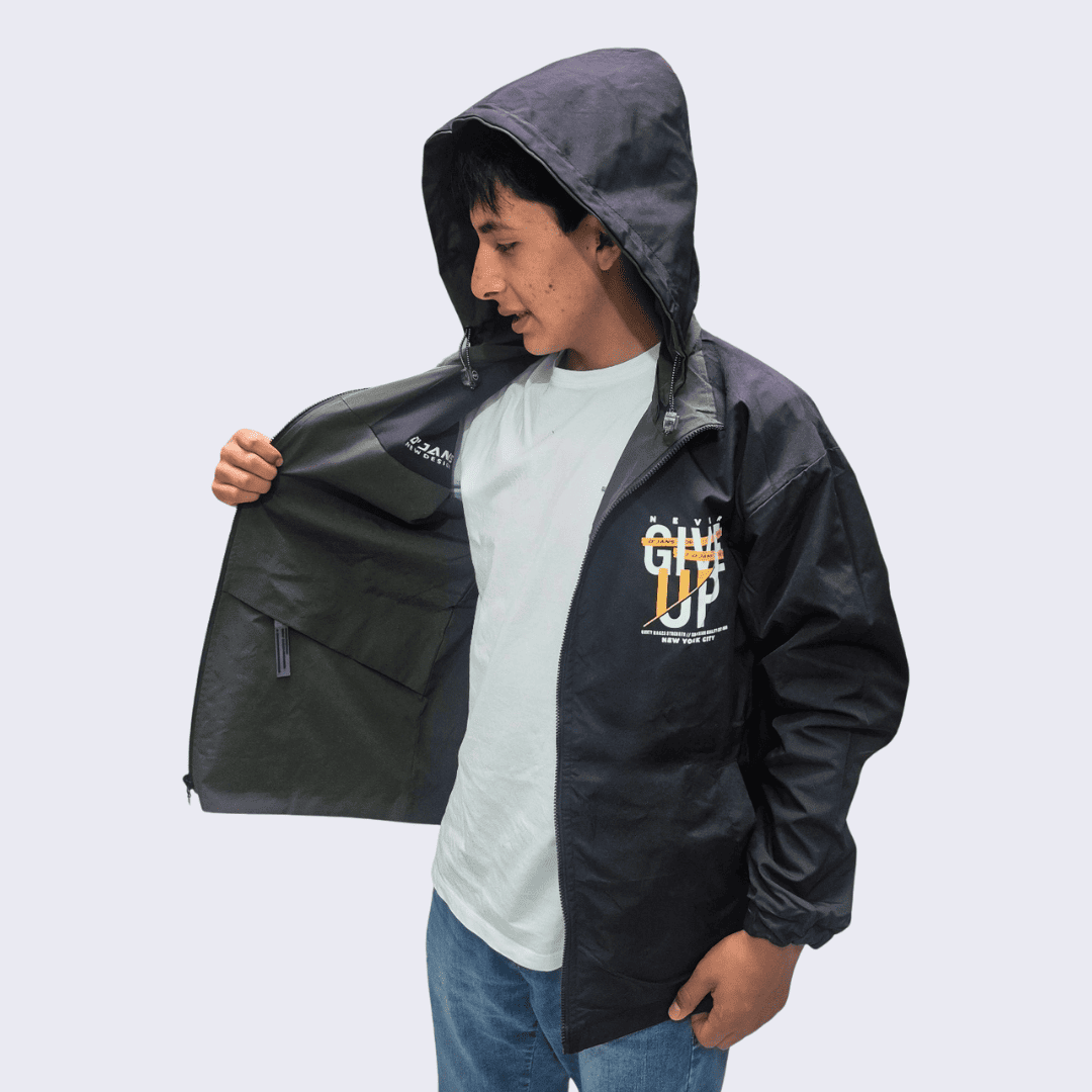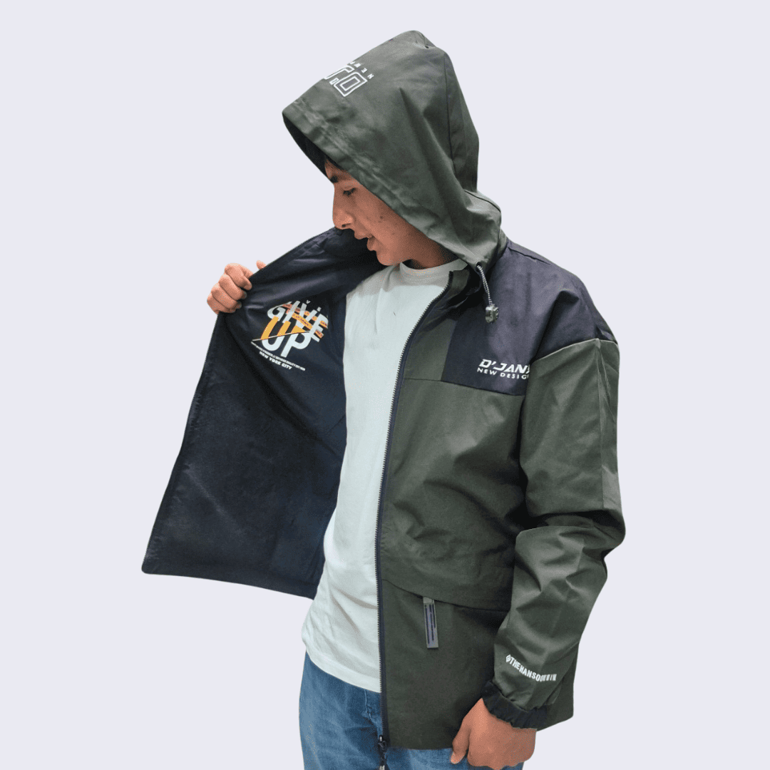 Casaca impermeable, reversible, moderna y funcional, ideal contra lluvia y viento. Lado principal en verde grisáceo oscuro, reverso negro para versatilidad. Cuenta con capucha ajustable, bolsillos frontales, puños elásticos y tejido ligero, resistente e impermeable. Perfecta para ciudad, aventura o entretiempo.