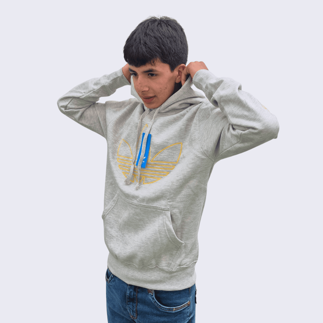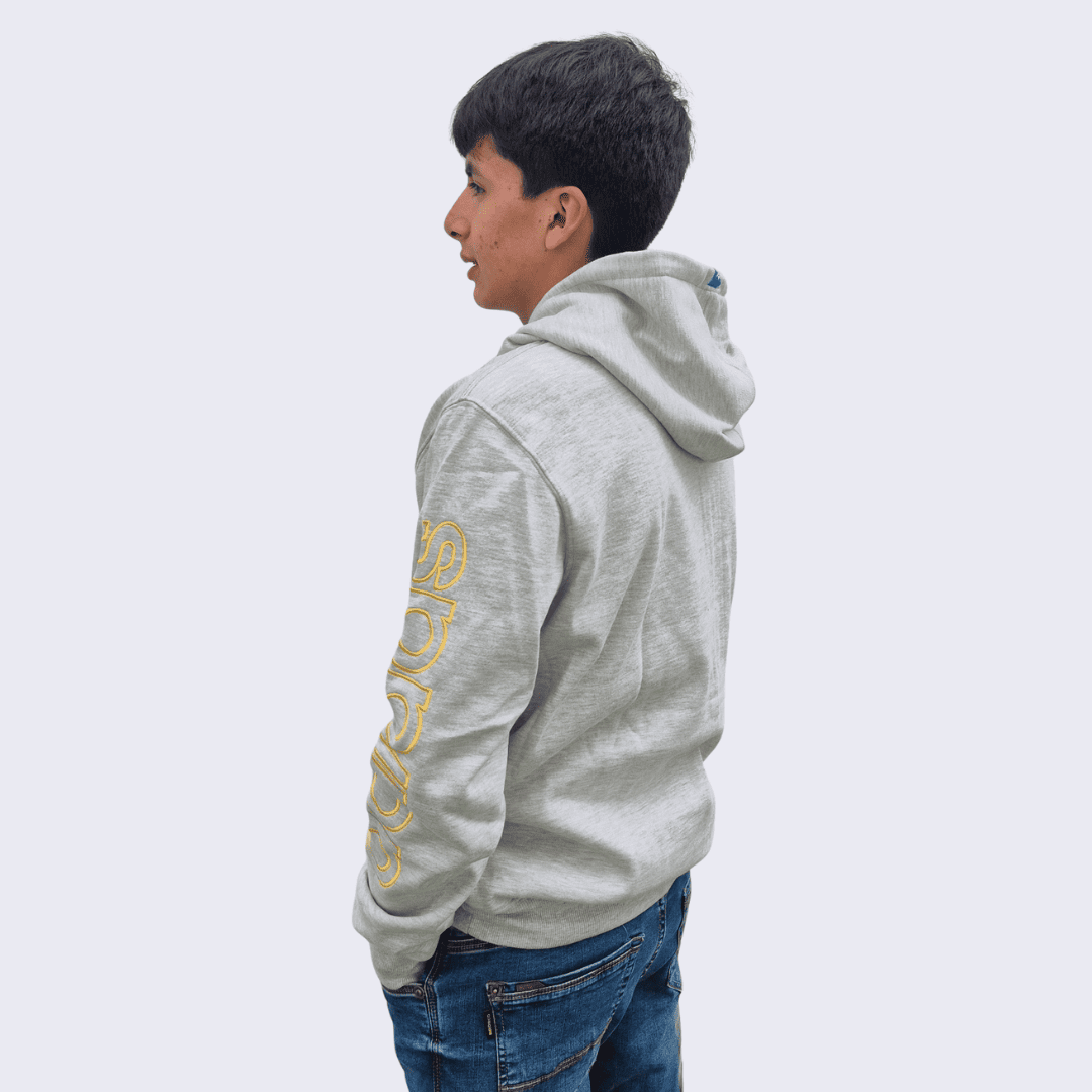 Sudadera premium en algodón-poliéster de alta densidad, gris cálido con bordados en hilo amarillo que destacan sin ser agresivos. Ajuste cómodo, construcción reforzada y caída natural para uso diario o casual.